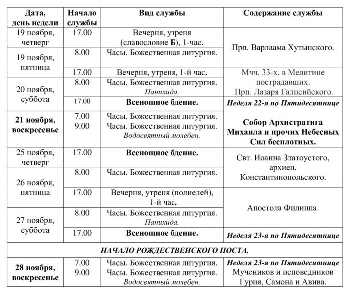 Расписание Богослужений