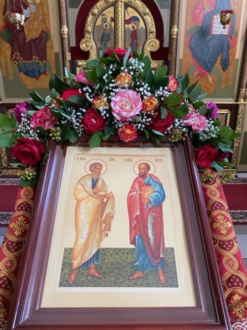 Величаем вас, / апостоли Христовы Петре и Павле, / весь мир ученьми своими просветившия // и вся концы ко Христу приведшия.
